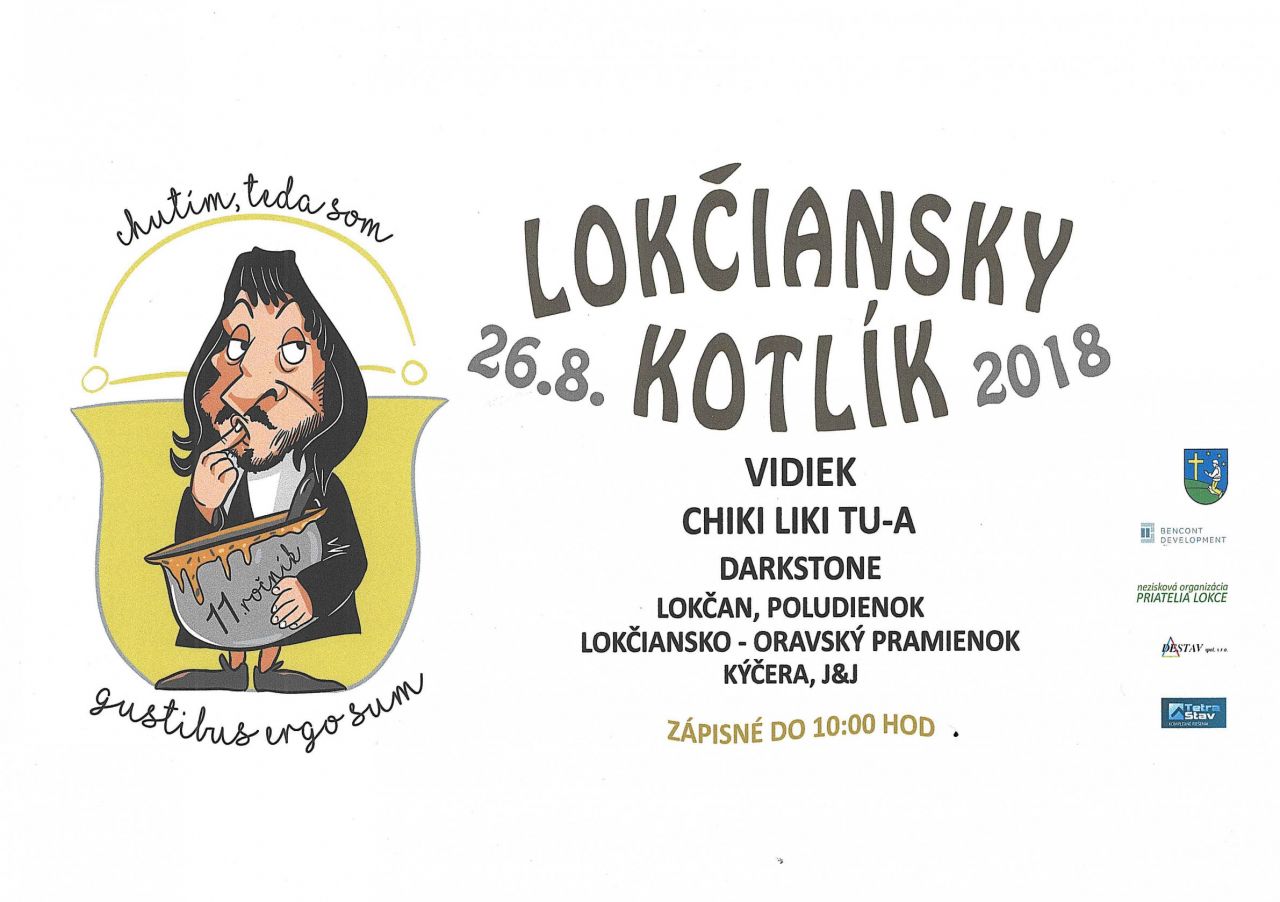 Pozývame Vás na Lokčiansky kotlík, ktorý sa bude konať 26.8.2018. Vystúpia Vidiek, CHiki liki tu-a, Darkstone, Lokčan, Poludienok, Lokčiansko - oravský pramienok, DH Kýčera a J&J.