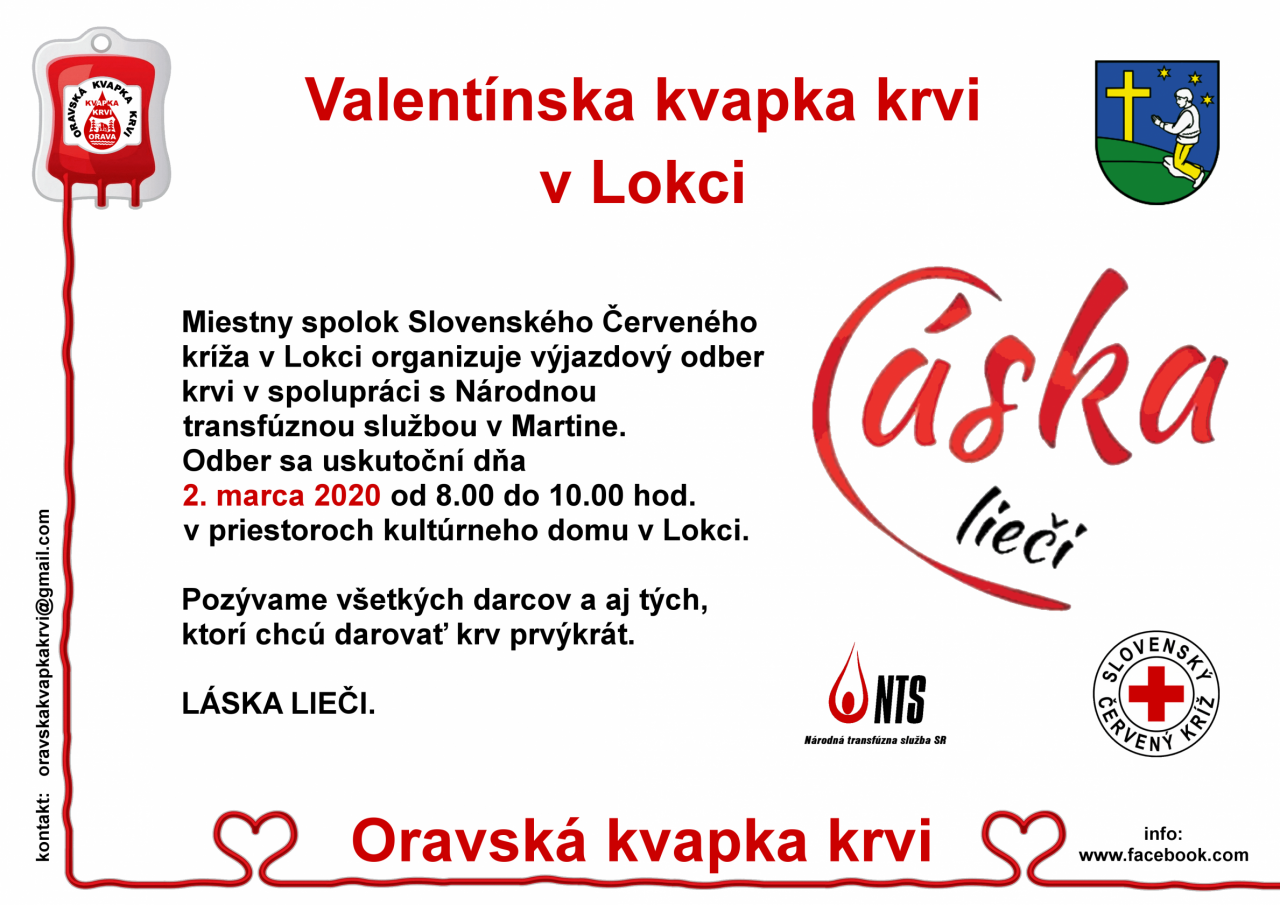 Dňa 2.marca 2020 v čase od 08.00 do 10.00 hod. sa uskutoční odber krvi v kultúrnom dome v Lokci. Pozývame všetkých darcov a aj prvodarcov.
