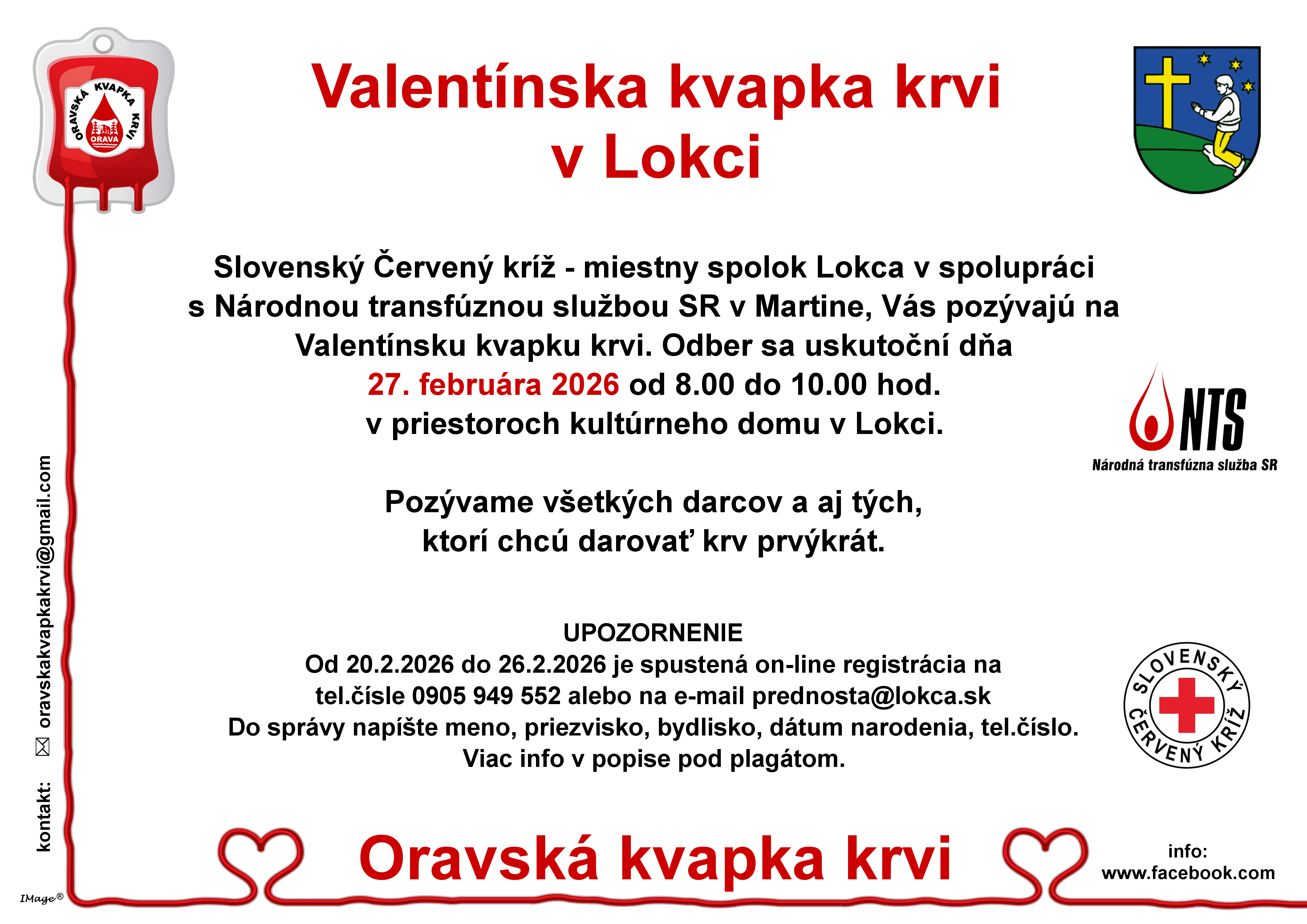 Slovenský Červený kríž v spolupráci s Národnou transfúznou službou SR pozýva všetkých darcov krvi na Valentínsku kvapku krvi, ktorá sa uskutoční 27. februára 2026 od 8:00 do 10:00 hod. v kultúrnom dome v Lokci. Všetci záujemcovia, vrátane tých, ktorí darujú krv prvýkrát, sú vítaní.