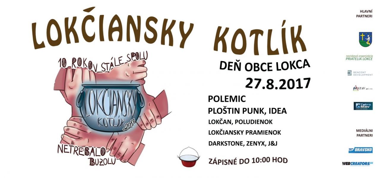Obecný úrad Lokca spolu s Neziskovou organizáciou Priatelia Lokce Vás srdečne pozývajú na Deň obce spojený so súťažou vo varení kotlíkového guľáša (10. ročník), ktorý sa uskutoční 27. augusta 2017 na Trojičnom námestí a v sále KD. Zápisné je do 10:00 hod. O kultúrny program sa postarajú: Polemic, Ploštín Punk, Idea, folklórne skupiny Lokčan, Poludienok, Lokčiansky Pramienok, skupiny Darkstone a Zenyx, DJ J&J. Všetci ste srdečne vítaní.